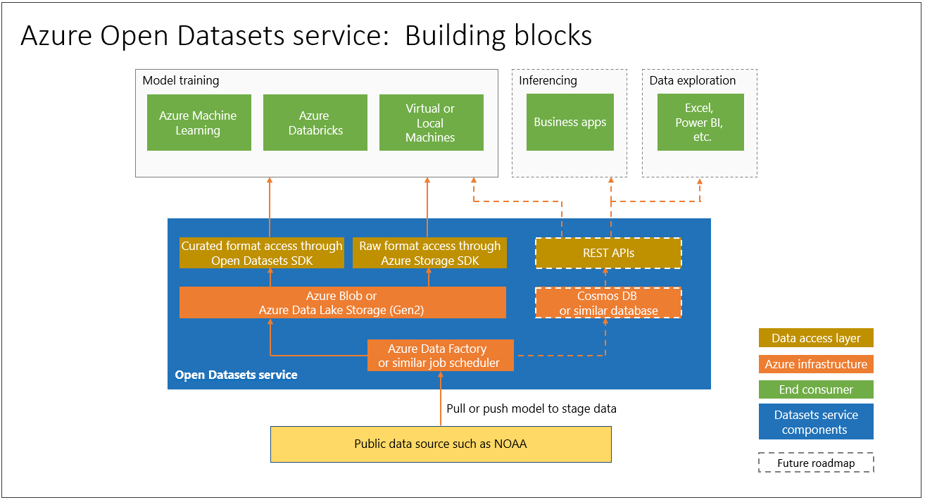 Azure Open Datasets are curated public datasets that you can add to scenario-specific features to machine learning solutions, for more accurate models. Open Datasets are available in the cloud, on Microsoft Azure. They're integrated into Azure Machine Learning and readily available to Azure Databricks. You can also access the datasets through APIs and you can use them in other products, such as Power BI and Azure Data Factory.