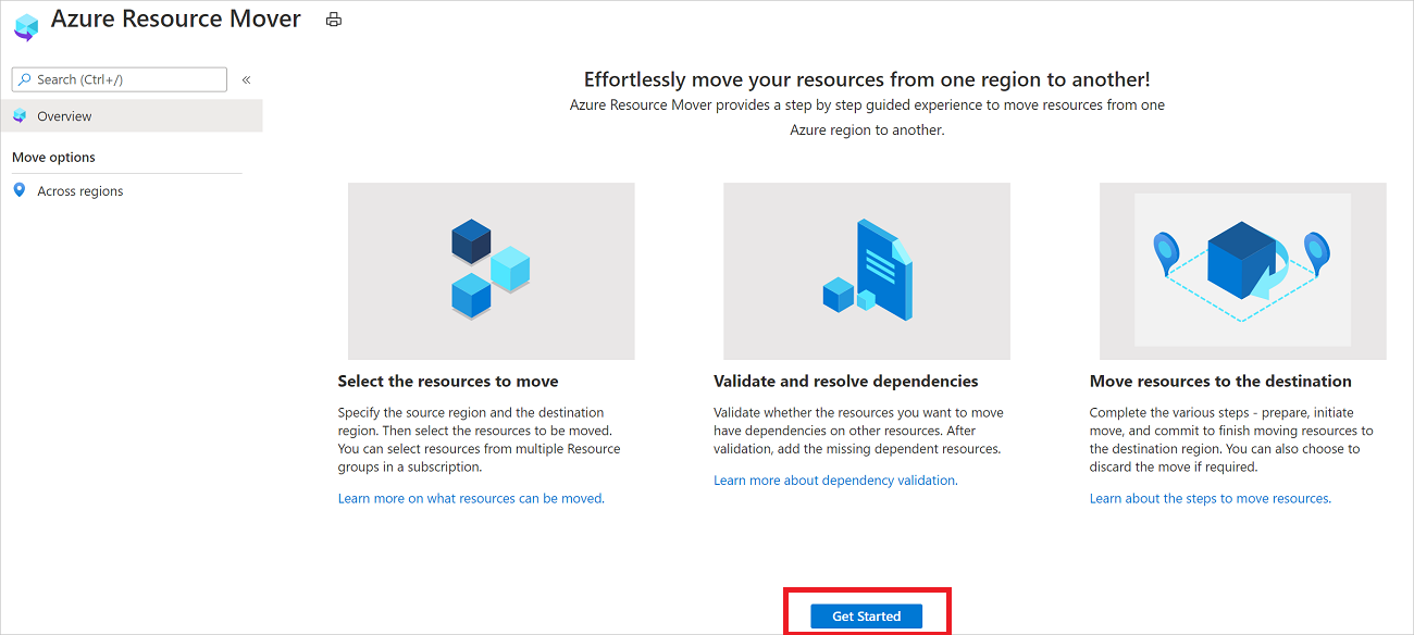On the Azure Resource Mover Overview pane, select Move across regions.