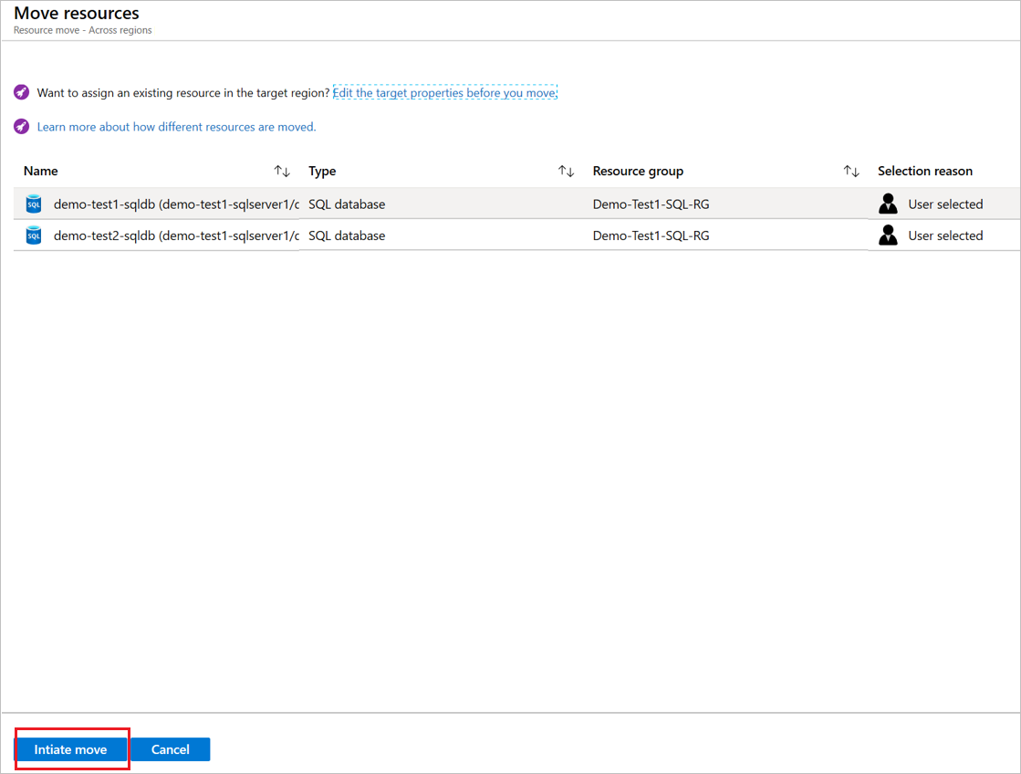 If you want to start the move again after discarding, select the SQL database, or elastic pool and initiate the move again.