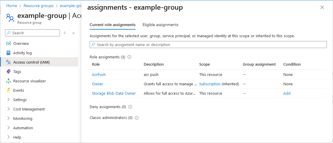 The following shows an example of the Access control (IAM) page for a resource group.