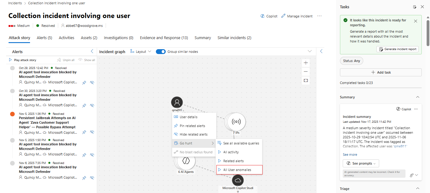 During incident investigations, analysts can launch built-in queries directly from incident graphs in the Defender portal to retrieve all user anomalies related to the case.