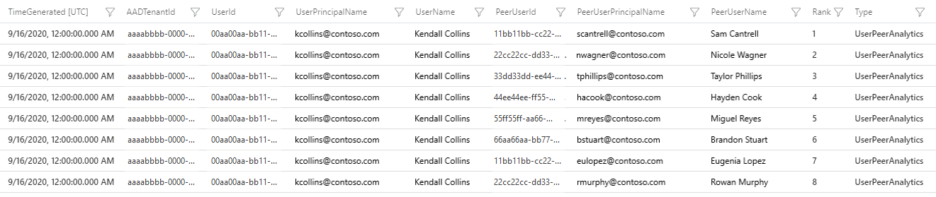 This screenshot shows an example of data in the UserPeerAnalytics table with the eight highest-ranked peers for the user Kendall Collins. Sentinel uses the TF-IDF algorithm to normalize weights when calculating peer ranks. Smaller groups carry higher weight.