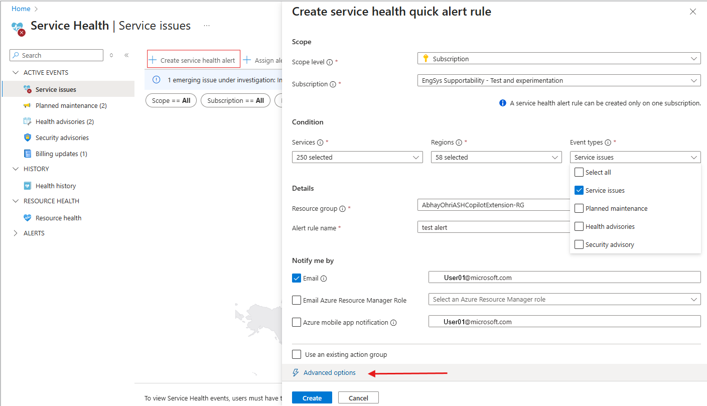 - Select Create to finish the alert, or if you want to add more detailed information for the service health alert, select Advanced Options to add more information to your alert.
