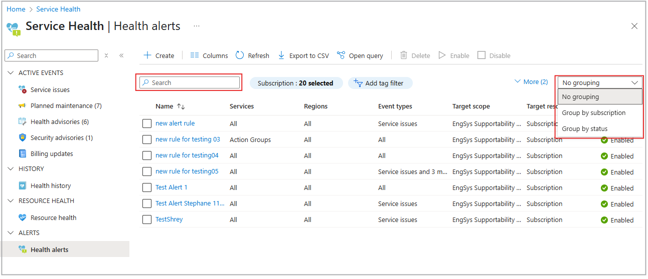 Select Health alerts from the left menu to search for and sort your alert rules by name. You can also group alert rules by subscription and status.