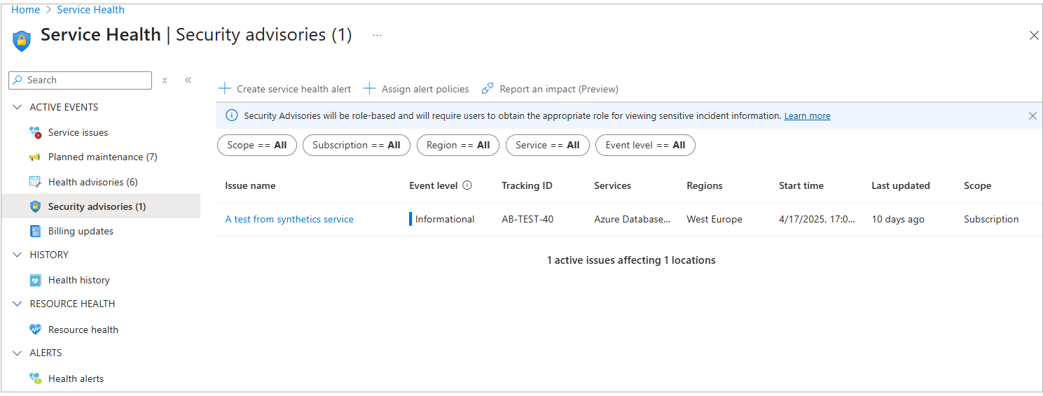 The Service issues, Health advisories, Security advisories, and Health history panes show events at both the Tenant and Subscription levels. For more information about roles, see Role-Based Access Control (RBAC) for security advisory resource impact.