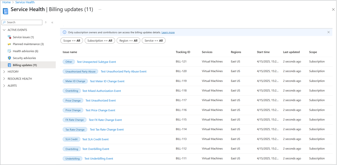 Select Billing updates from the left menu to see billing updates. Only users with subscription owner or contributor permissions can access this information. For more information, see In-portal billing.