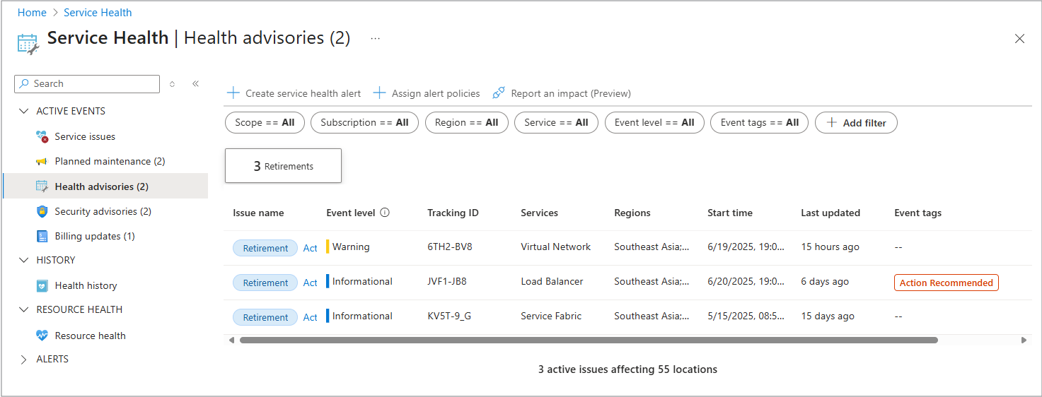 - Security advisories: Security-related notifications or violations that might affect the availability of your Azure services.