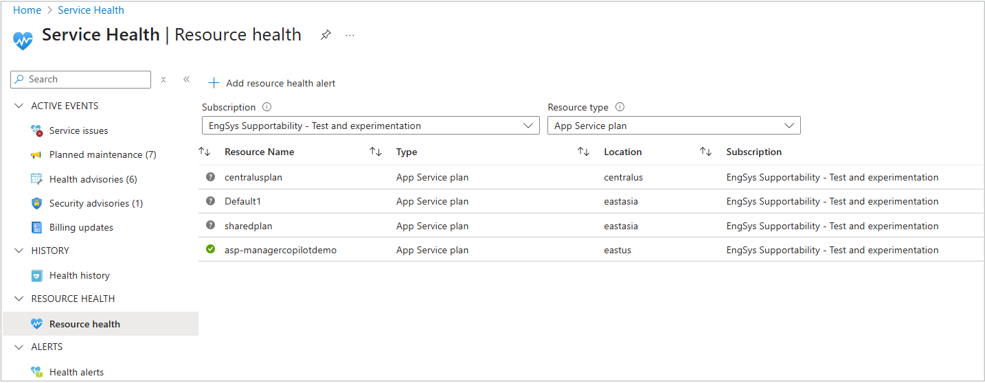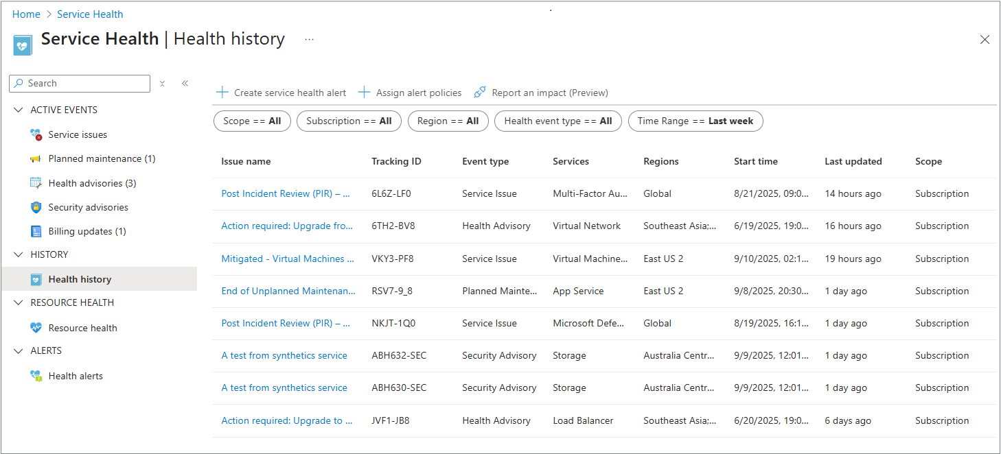 Select Health history from the left menu to see a detailed view of the health status of your Azure services and resources. You can monitor outages, track incidents and configure alerts. For more information, see Health history overview.