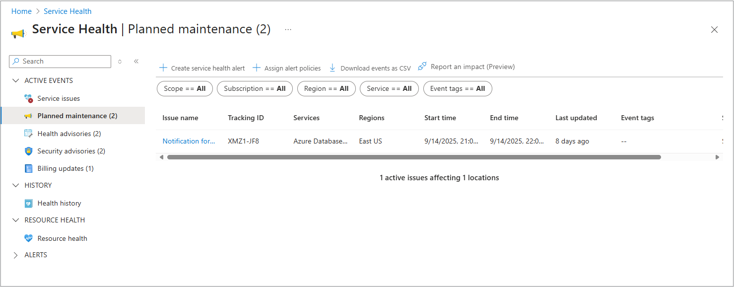 - Planned maintenance: Upcoming maintenance that can affect the availability of your services in the future.