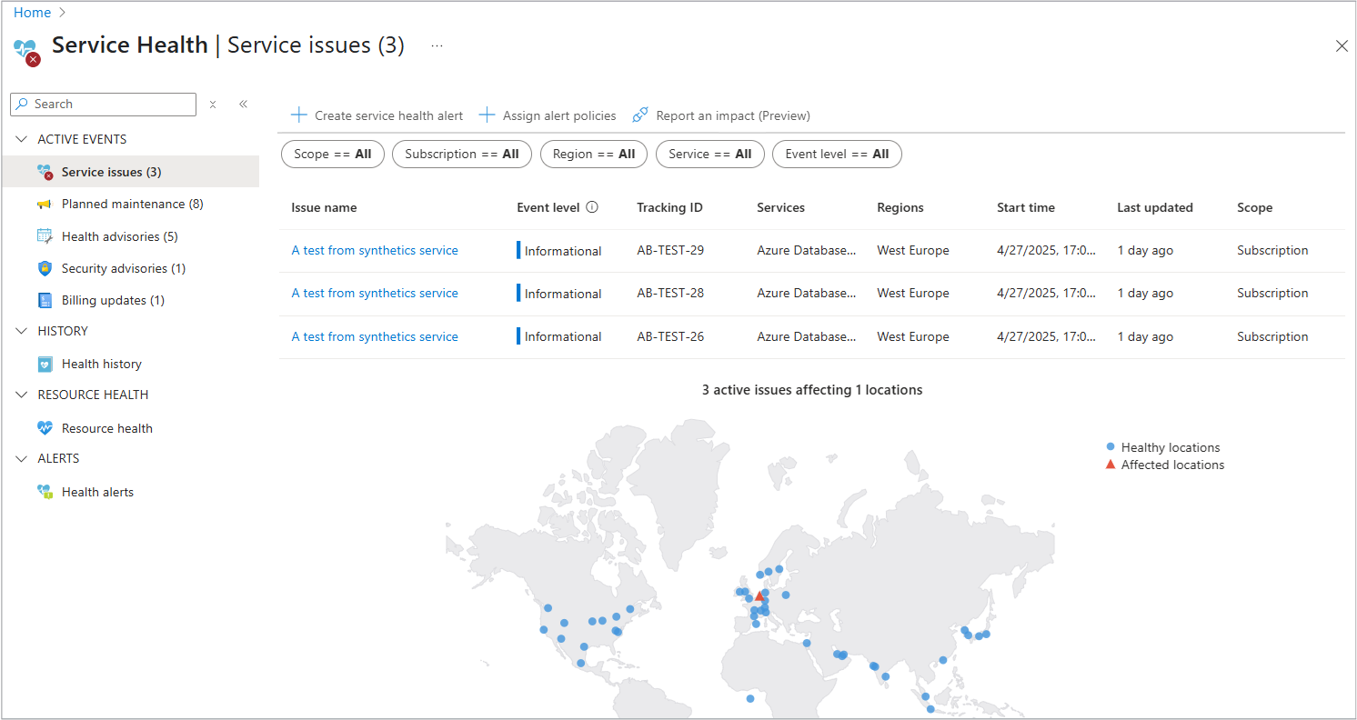 - Service issues: Problems in the Azure services that affect you right now.