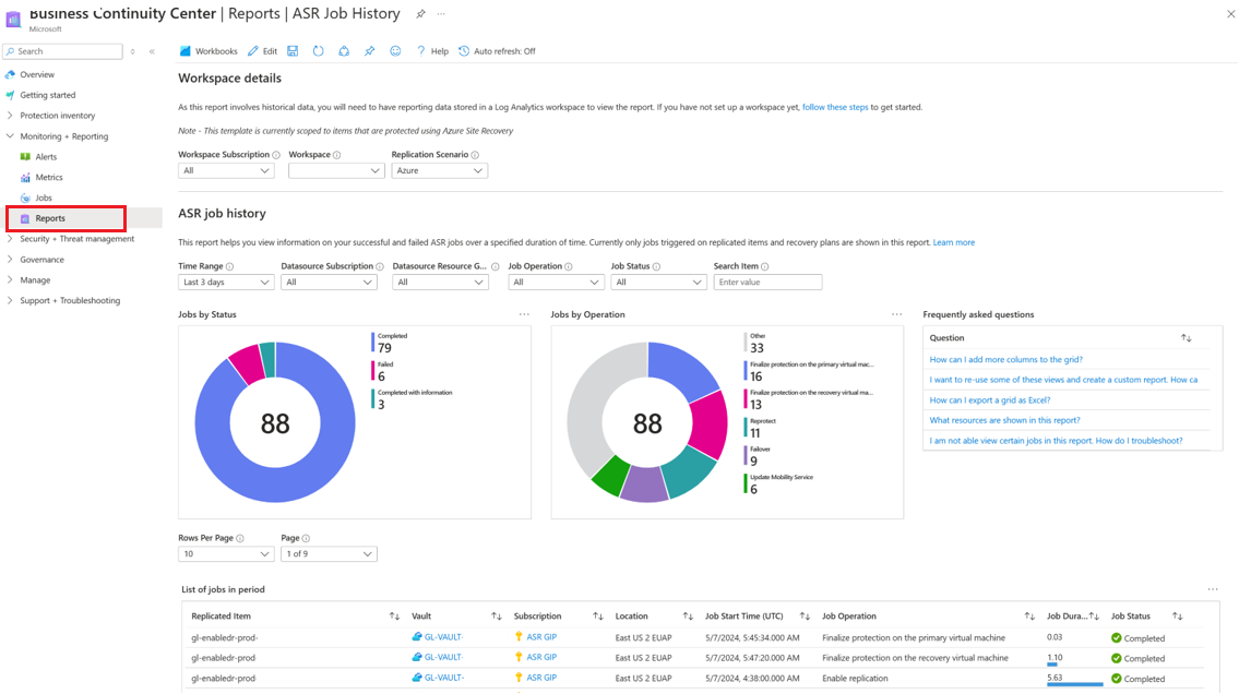 This report provides information about the Site Recovery jobs by operation type and completion status. This report includes information on job status, start time, duration, vault, subscription, and more.