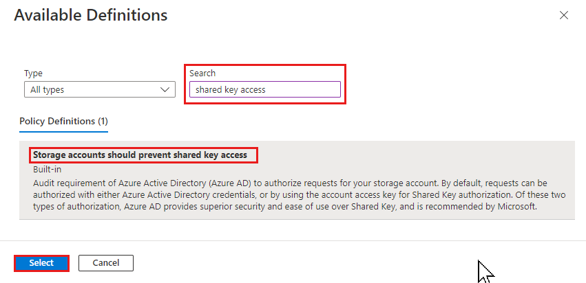 For the Policy definition field, select the More button (...), and enter shared key access in the Search field. Select the policy definition named Storage accounts should prevent shared key access.