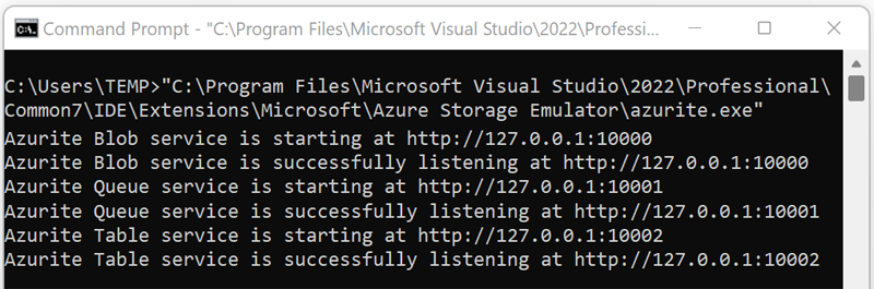 Navigate to the appropriate location and start azurite.exe. After you run the executable file, Azurite listens for connections.