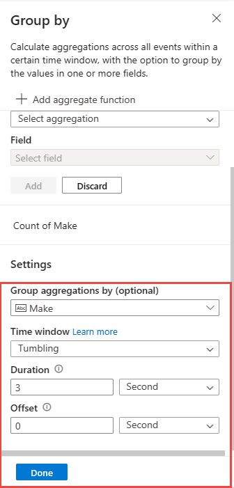 Select the Group by tile on the canvas and connect it to the event hub tile.
