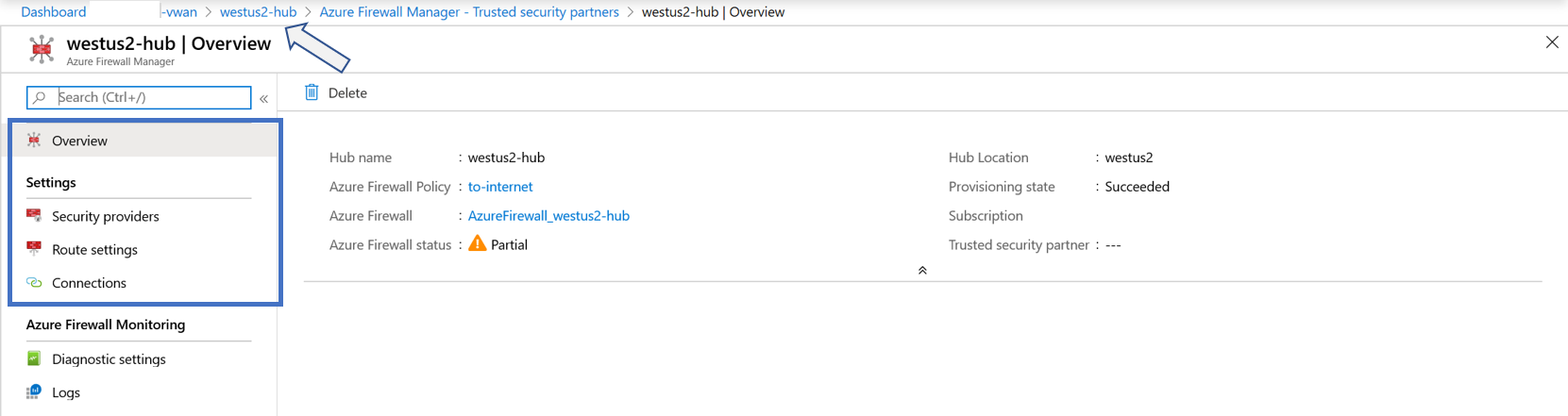 To return to the hub Overview page, you can navigate back by clicking the path, as shown by the arrow in the following figure.