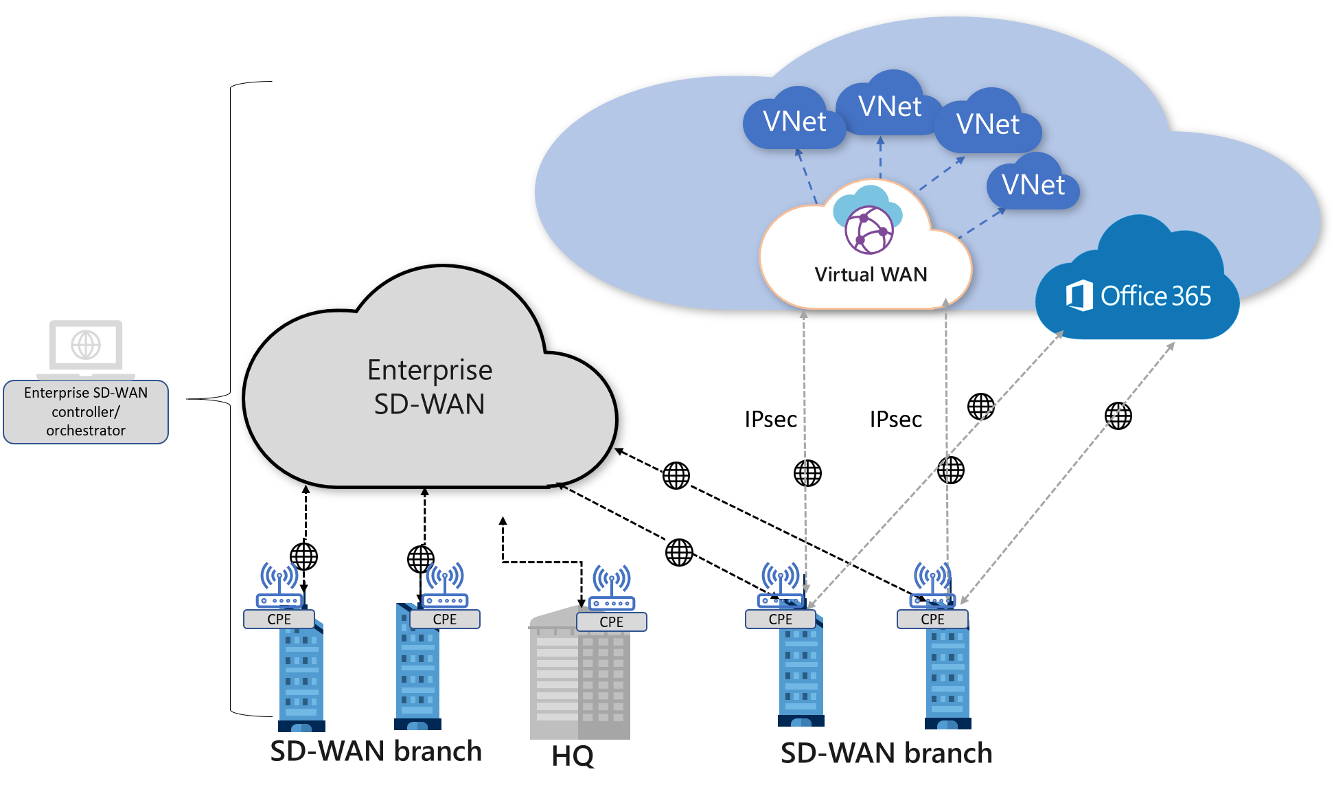 In this architecture model, SD-WAN branch CPEs are indirectly connected to Virtual WAN hubs. As the figure shows, an SD-WAN virtual CPE is deployed in an enterprise VNet. This virtual CPE is, in turn, connected to the Virtual WAN hub(s) using IPsec. The virtual CPE serves as an SD-WAN gateway into Azure. Branches that need to access their workloads in Azure will be able access them via the v-CPE gateway.