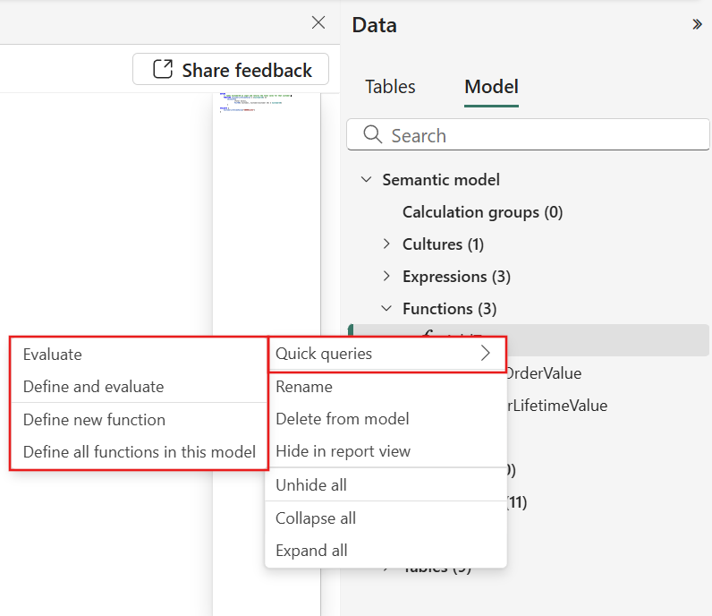 In DAX query view, you can use Quick queries in the right-click menu of a UDF within Model explorer to easily define and evaluate functions.