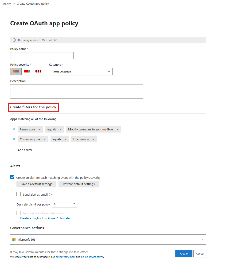 Screenshot that shows how to create an OAUth app policy in the Microsoft Defender portal.
