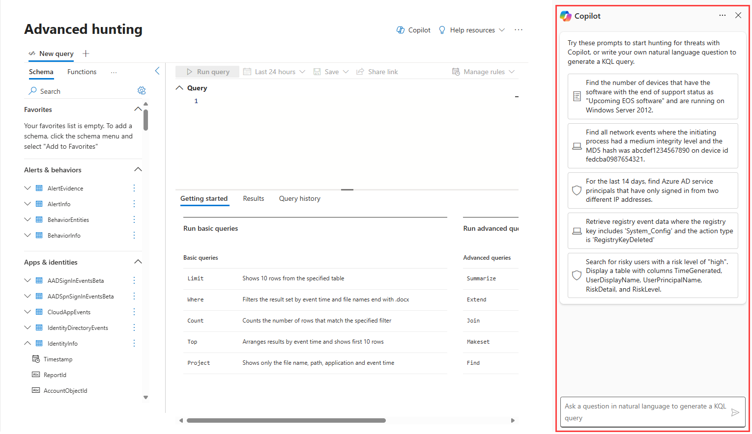 Open the Advanced hunting page from the navigation bar in Microsoft Defender portal. The Security Copilot side pane for advanced hunting appears at the right hand side.