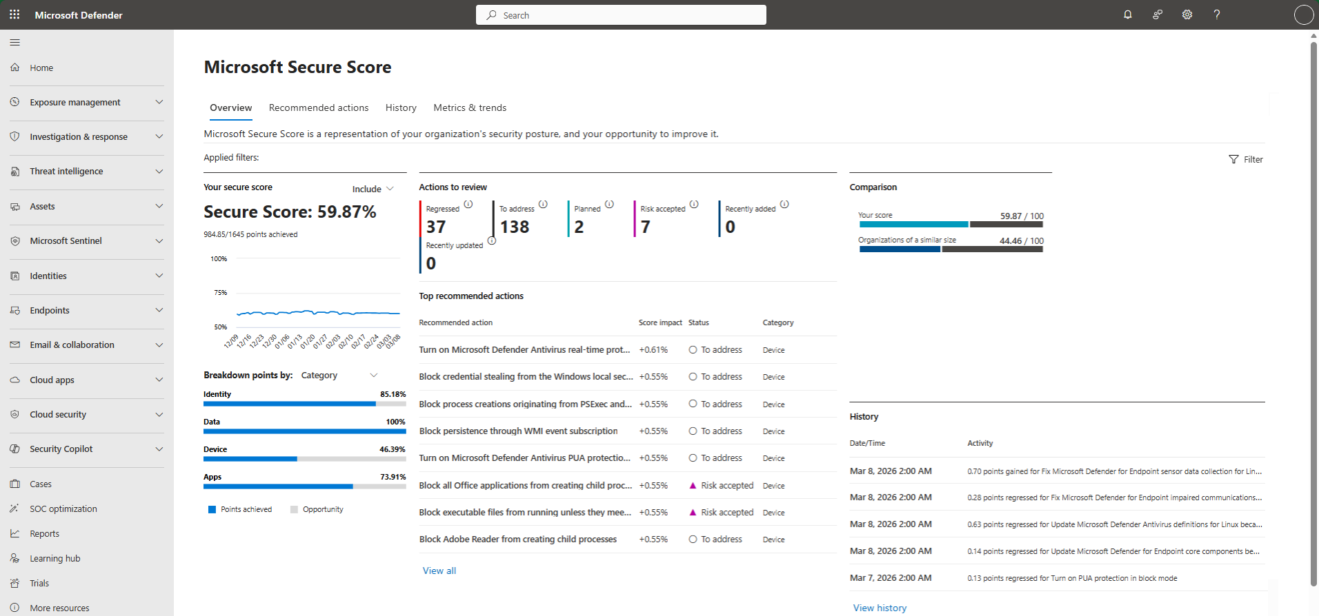 Following the Secure Score recommendations can protect your organization from threats. From a centralized dashboard in the Microsoft Defender portal, organizations can monitor and work on the security of their Microsoft 365 identities, apps, and devices.