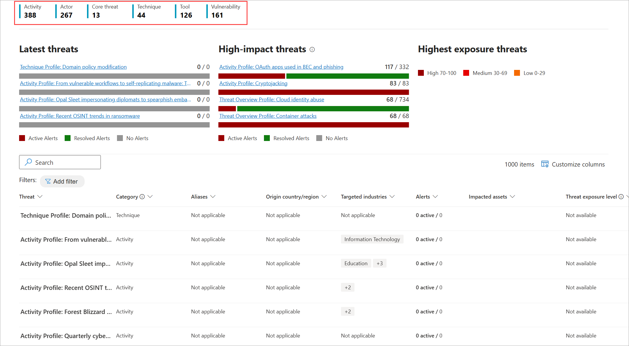 - Latest threats—lists the most recently published or updated threat reports, along with the number of active and resolved alerts.