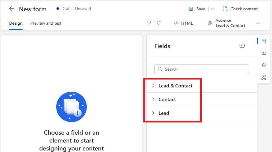 After you select the Lead & Contact audience, you see three sections of fields in the right pane.