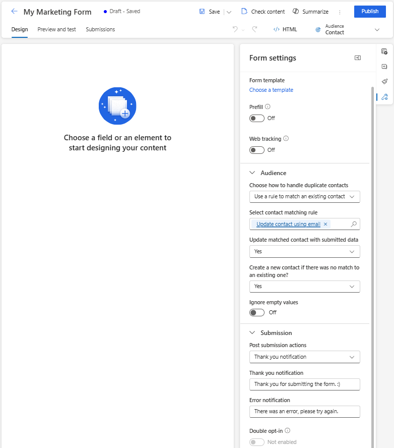 - Audience: Set how to handle duplicate records by selecting the matching rule. Choose whether form submission creates new records or updates existing records. If Update matched contact with submitted data and Create a new contact if there was no match to an existing one? are set to No, the form submission doesn't update or create any record. The form submission can link to an existing record identified by the matching rule. To make sure existing values aren't overwritten by submitted empty values, turn on the Ignore empty values toggle.