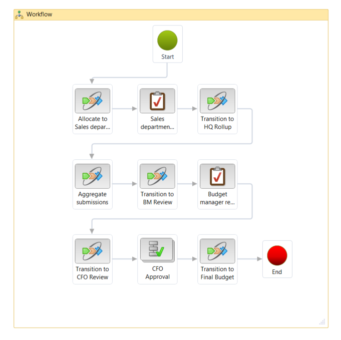 A good practice is to create a budget planning workflow for each level of a budgeting hierarchy. You then assign a budgeting workflow that contains elements that correspond to the stages in the budget planning workflow. In the example schema that appears earlier in this article, one budget planning workflow will be created for the Sales departments, and another will be created for the headquarters. A budgeting workflow moves the budget plans through the stages.