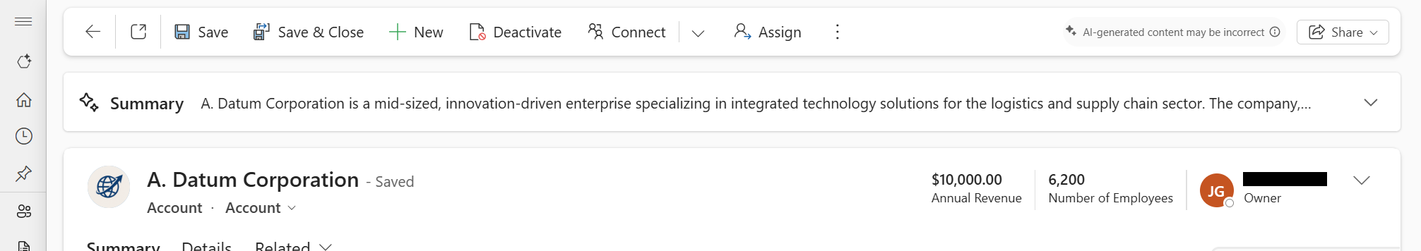 • Forms: When viewing a record in a main form, the summary appears in the insights bar at the top of the main form. Screenshot that shows a row summary card in the insights bar on a form.
