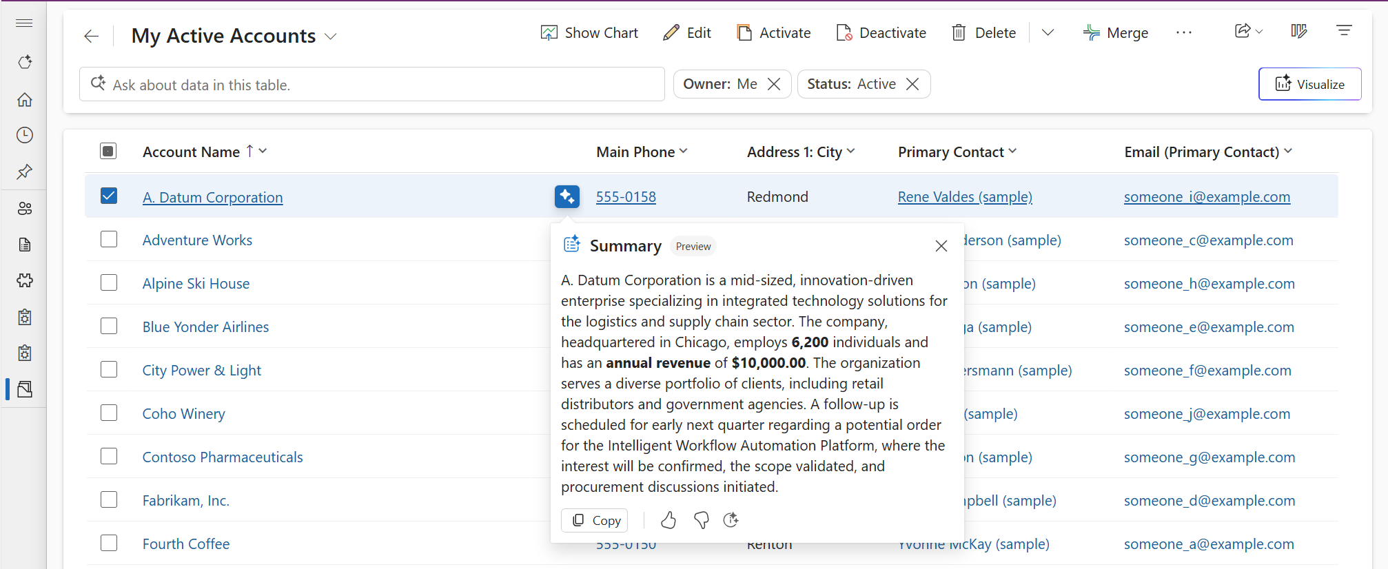 The Row summary feature in model-driven apps provides users with a concise, AI-generated overview of key details about a record. Summaries help users quickly understand essential information without manually scanning fields, related records, or activity timelines. You see summaries as a paragraph or bullet points, so they're easy to read.