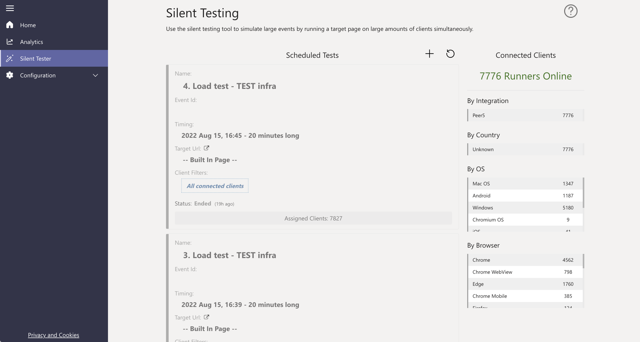 The management dashboard allows tests to be scheduled, modified, and canceled, and also shows the number of connected runners. The main window lists pending tests, ongoing tests and past tests that have already ended. Completed tests are shown for 24 hours and are then hidden from the list.