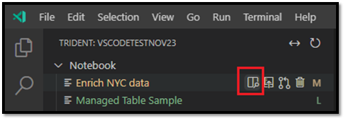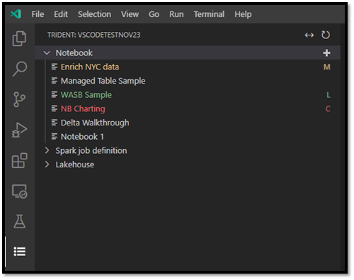 - Modified: The M character to the right of the name and yellow text indicates you downloaded and edited the notebook locally in VS Code, and didn't yet publish those pending changes back to the remote workspace.
