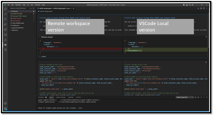 Select the Update Notebook option. VS Code pulls the latest version from the remote workspace, and opens the VS Code diff editor so you can compare the two notebook files. The left-side screen is from the workspace and the right-side screen is from the local version: