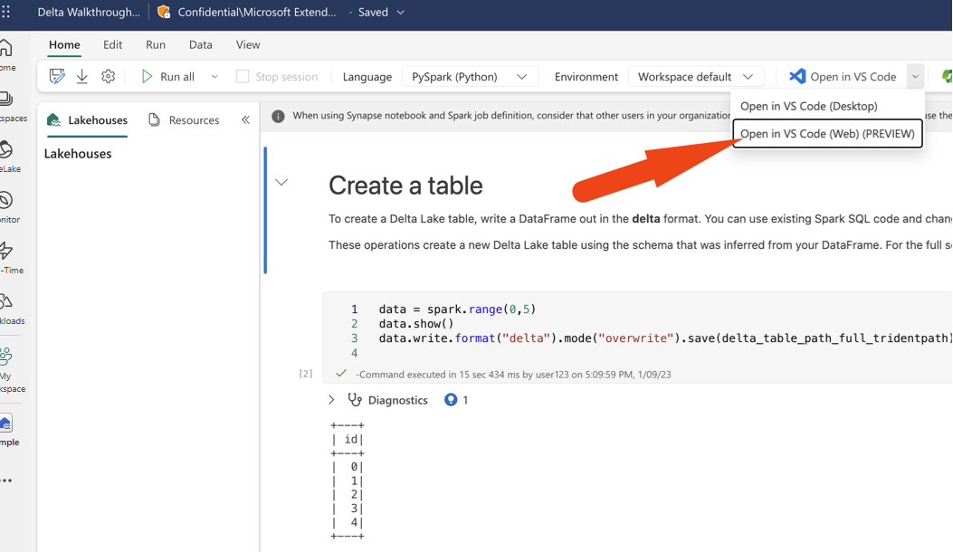 Open a notebook with the Fabric Data Engineering VS Code extension for the Web