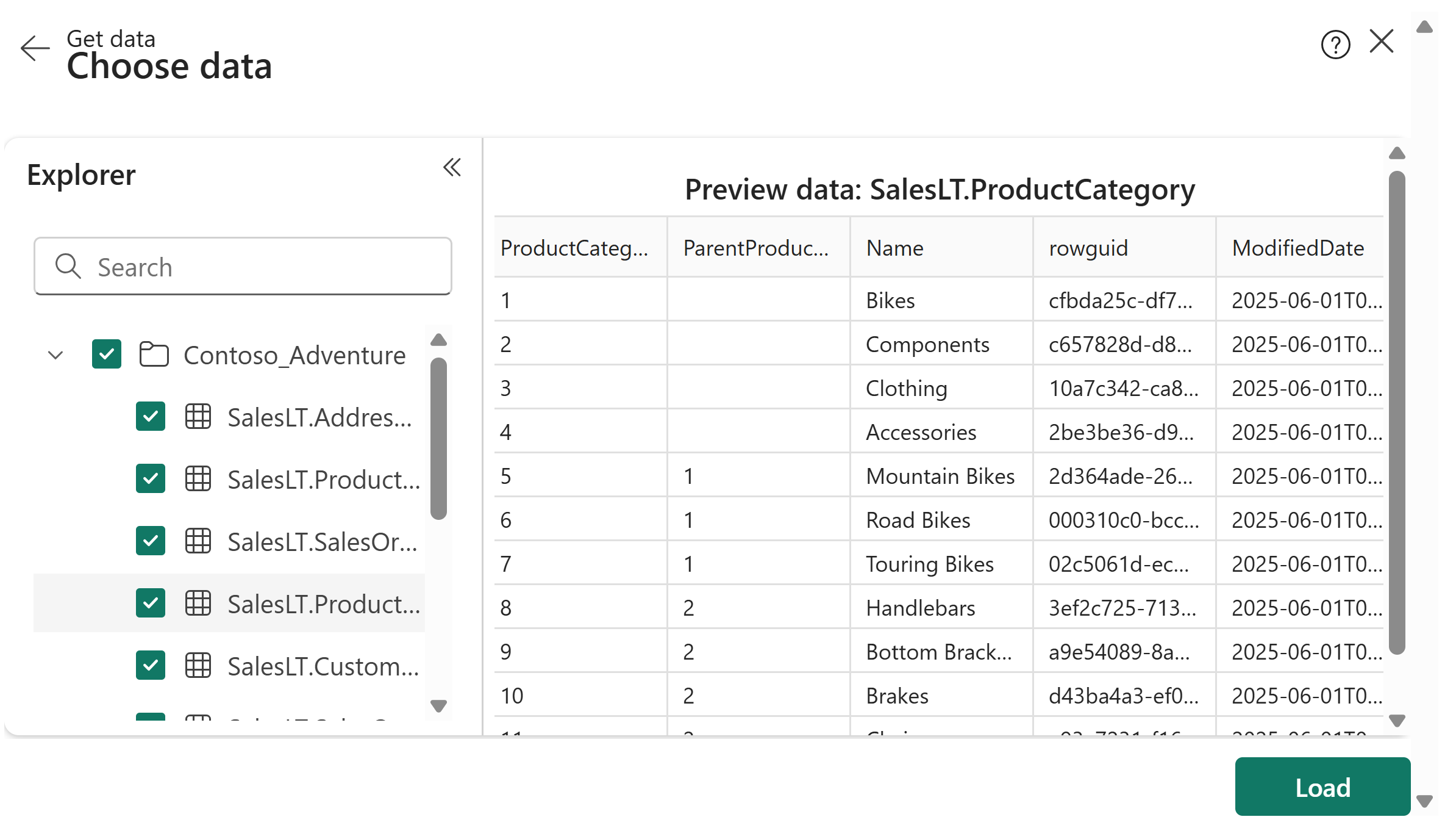 • In this guide, we use an AdventureWorks SQL analytics endpoint linked to a mirrored database as an example data source. To get the AdventureWorks sample data, see Load AdventureWorks sample data in your SQL database.