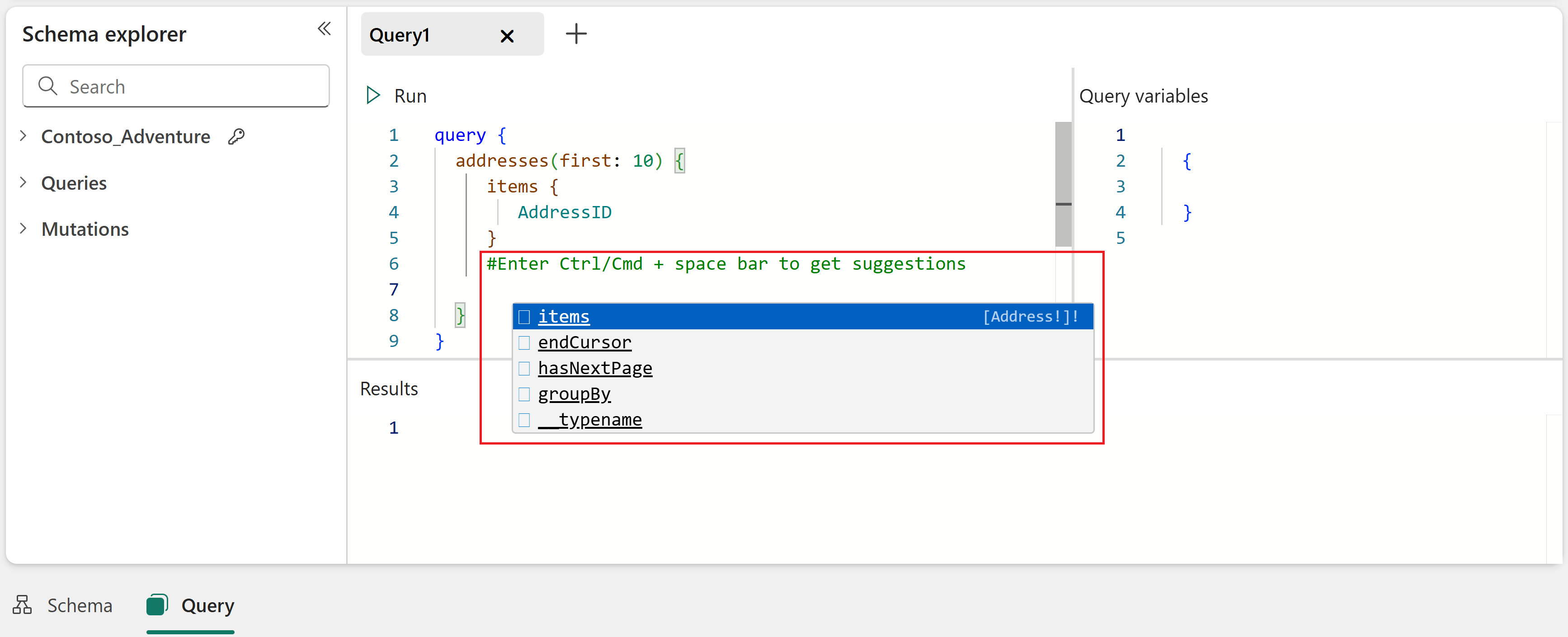 Enter Ctrl/Cmd + space bar to get suggestions while writing your queries in the editor.