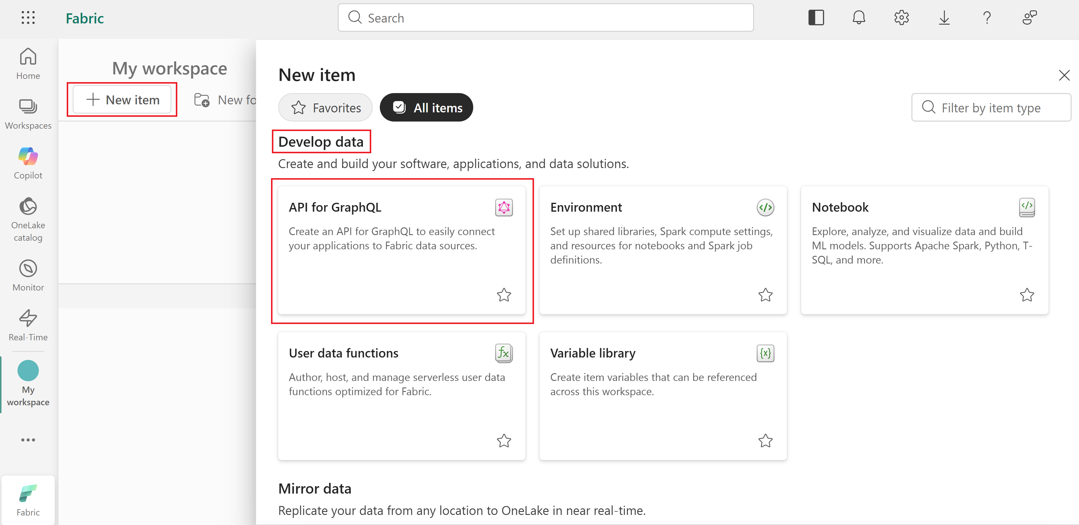 2. Select a workspace where you want to create the API and then select New item. In the panel that opens, under Develop data, select API for GraphQL.