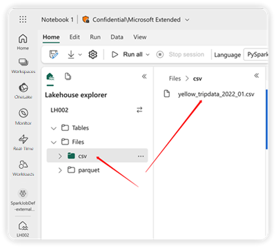 The structure of the Lakehouse shown in the Notebook is the same as the one in the Lakehouse view. For the detail please check Lakehouse overview. When you select a file or folder, the content area shows the details of the selected item.
