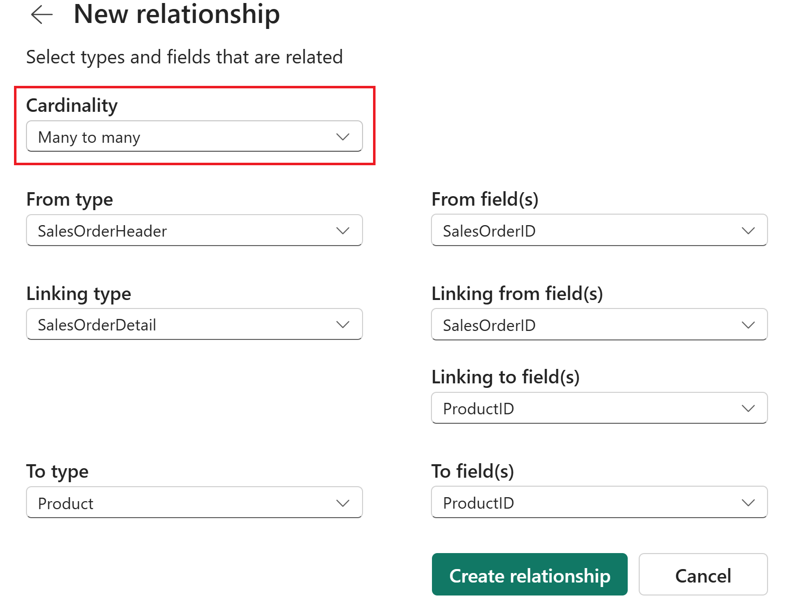 SalesOrderHeaderandProductin a many-to-many relationship, you needSalesOrderDetailas the linking type. This linking type must have foreign keys pointing to both of the types you want to relate (such asSalesOrderIDandProductID). Learn more about many-to-many relationships.