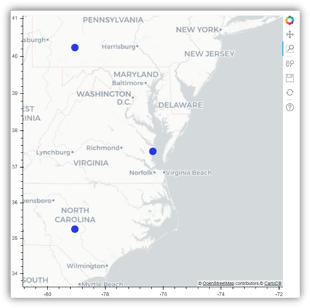 The following image is an example of plotting glyphs over a map using bokeh.