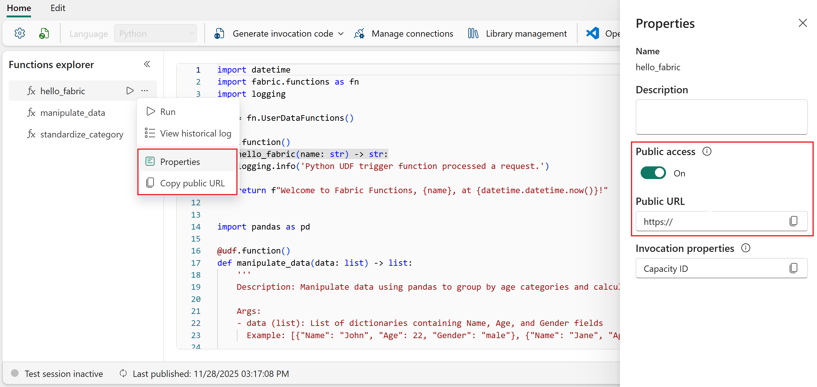 Each user data function has a unique public URL that serves as its REST API endpoint. Before you can call the function from an external application, you need to enable public access and get the URL.