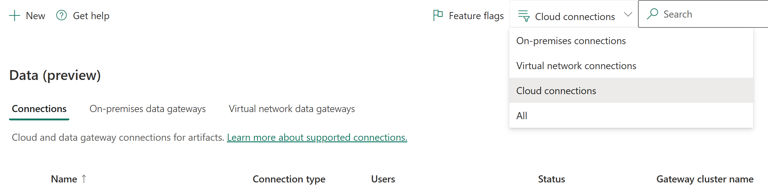 Right now, cloud connections work with pipelines and Kusto. For datasets, datamarts, and dataflows, you need to use Power Query Online's "get data" experience to create personal cloud connections.