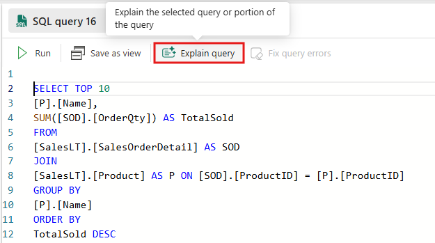 Screenshot from the Fabric portal showing the Explain action and a block of highlighted T-SQL text.