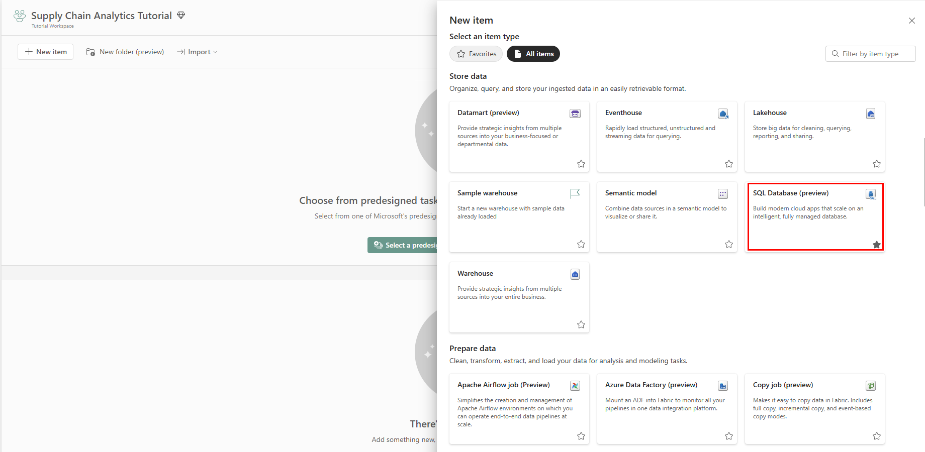 3. In the New Item | All Items panel, scroll to the Store Data area and select SQL database.