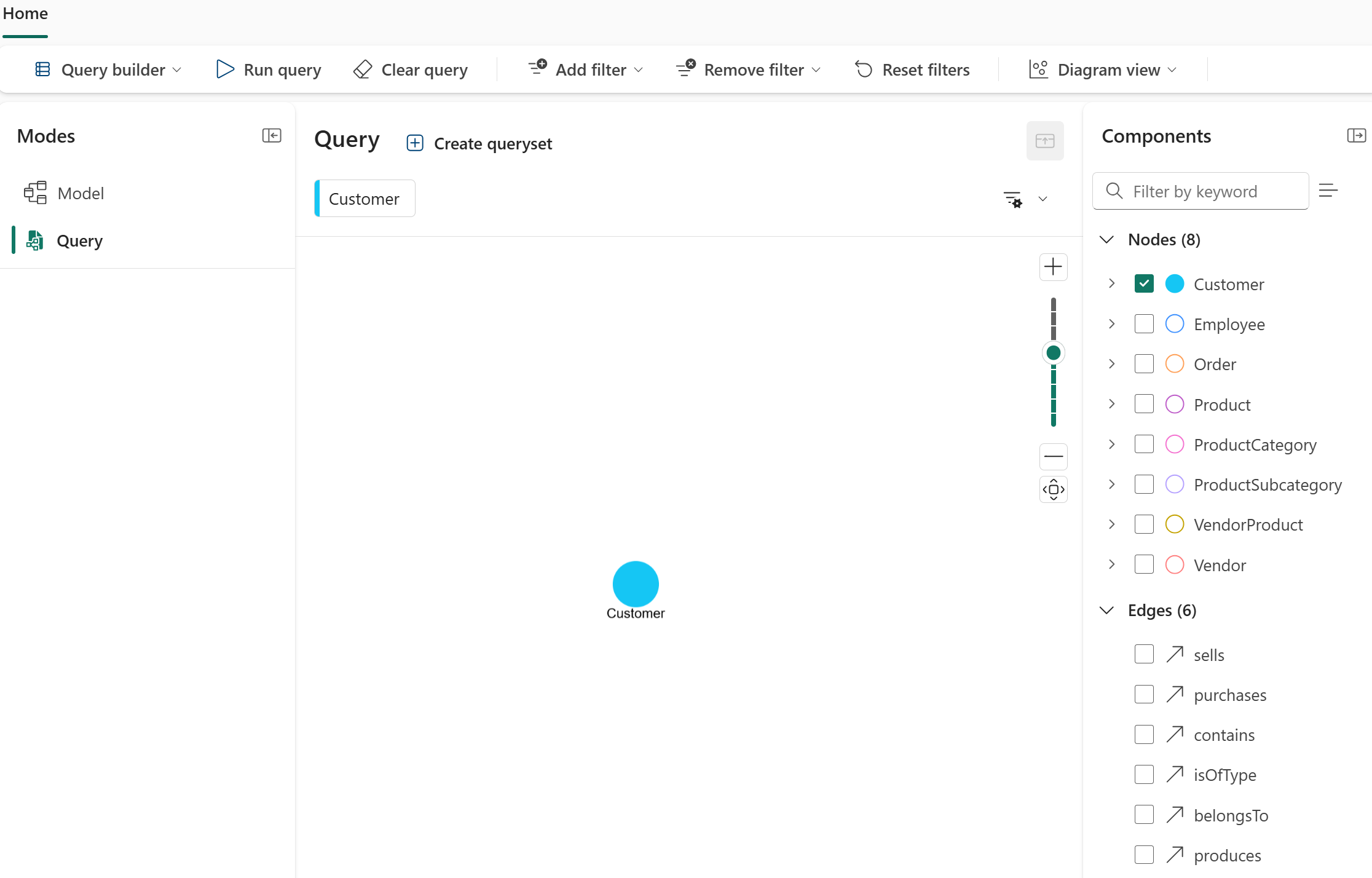 In this tutorial step, you query your graph by using the visual query builder. The query builder provides an interactive way to explore your graph by selecting nodes and relationships.