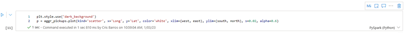Run the remaining cells sequentially to create a heatmap of NYC taxi pickups. For more information on Kqlmagic, see Use a Jupyter Notebook and Kqlmagic extension to analyze data