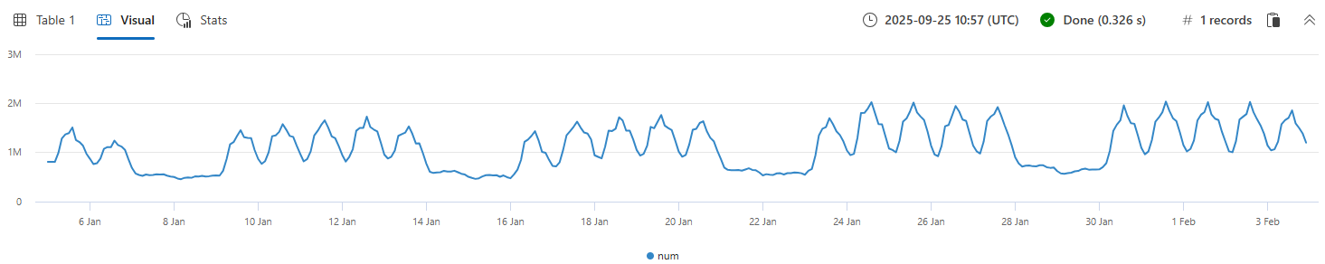 make-seriesoperator to create three time series, where:num=count(): traffic count.from min_t to max_t step 1h: creates the time series in one hour bins from the table's oldest to newest timestamp.default=0: specifies the fill method for missing bins to create regular time series. Alternatively, useseries_fill_const(),series_fill_forward(),series_fill_backward(), andseries_fill_linear()for different fill behavior.by OsVer: partitions by OS.