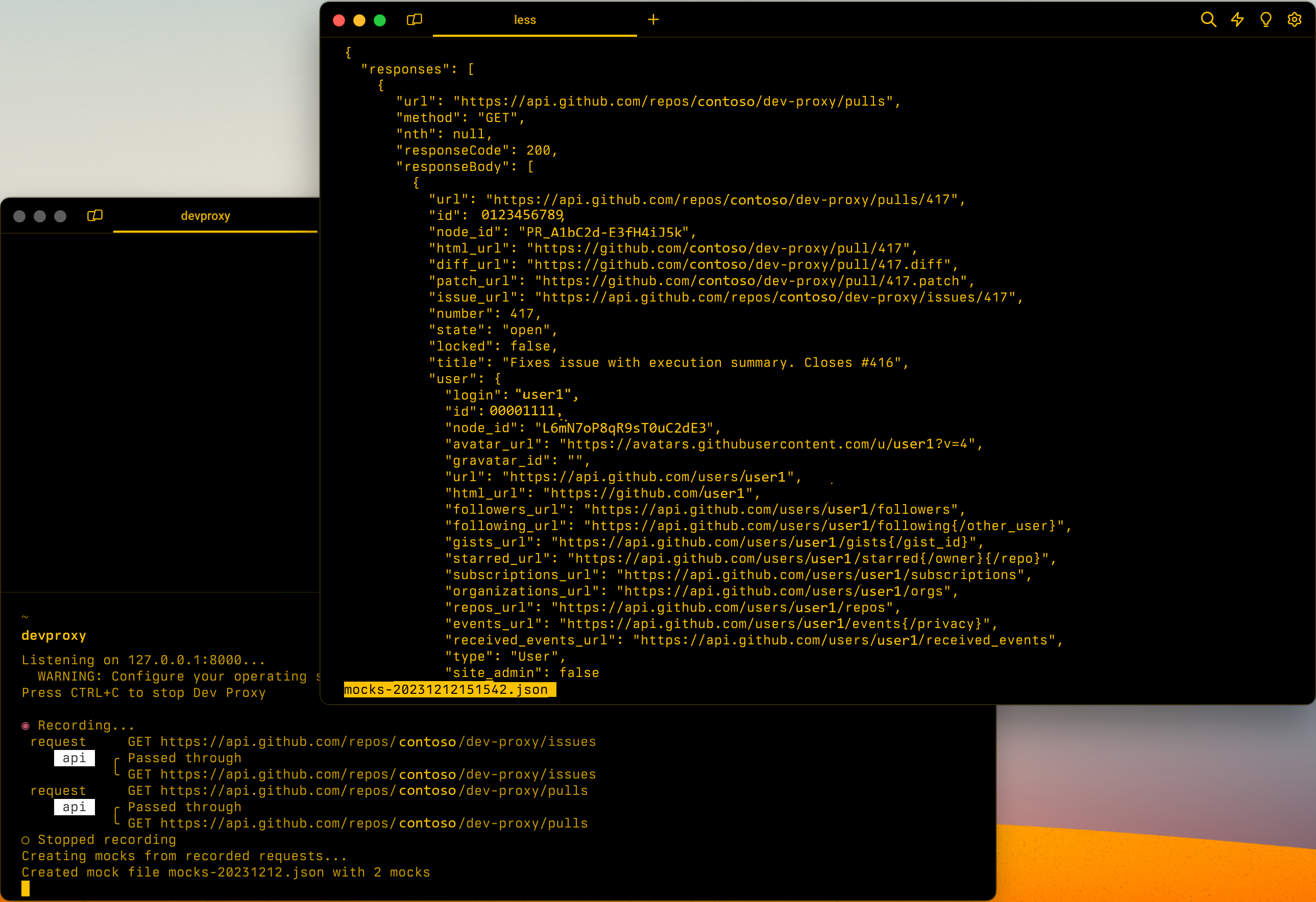 To intercept requests, after starting Dev Proxy, start recording. When you're done, stop recording. Dev Proxy will generate mocks for the intercepted requests and write them to a file named mocks-yyyyMMddHHmmss.json in the current working folder.