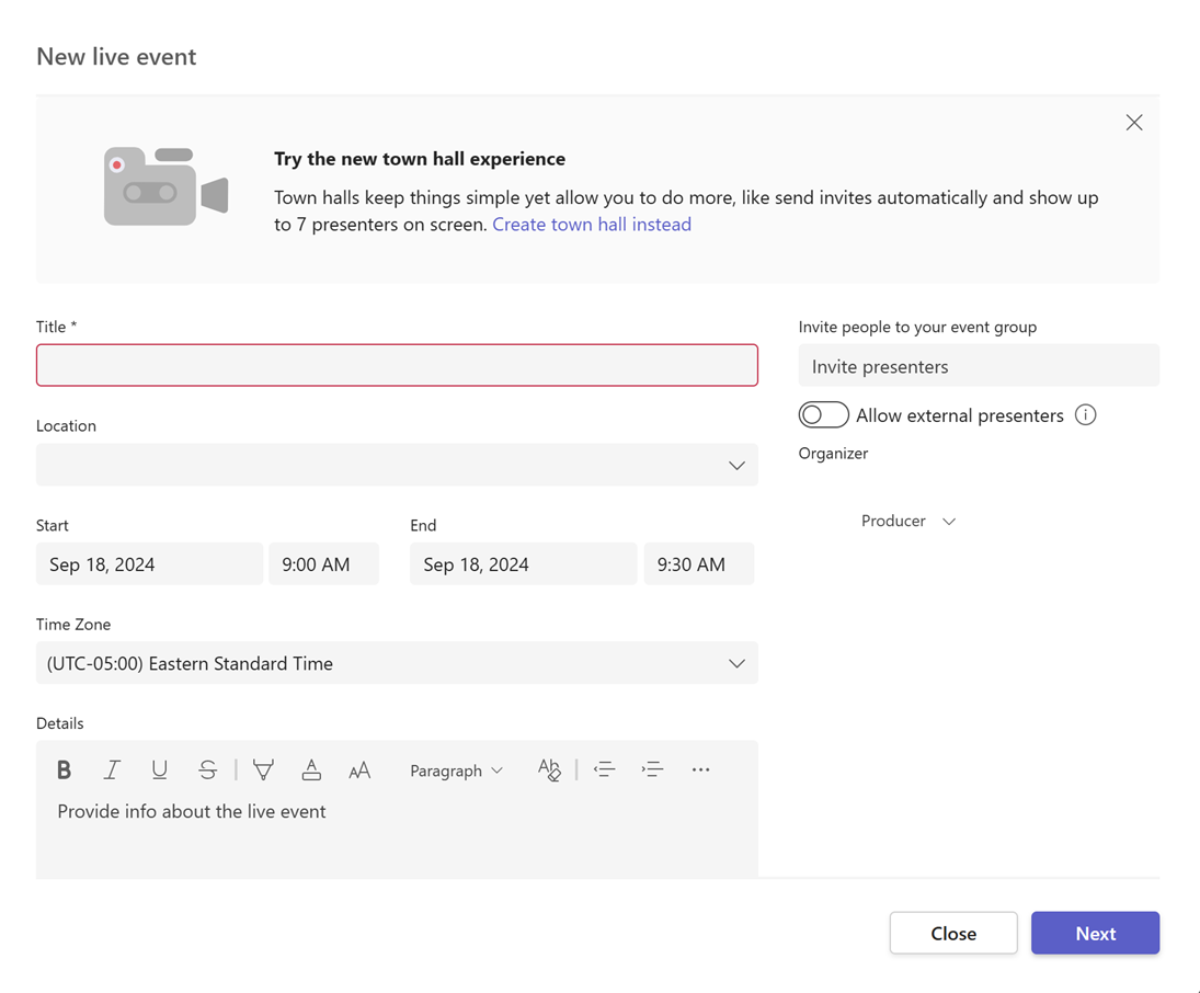 Teams live events will retire in July 2026. Events that have already been scheduled will be supported through February 28, 2027. We recommend that you upgrade to Teams town hall to take advantage of the improved experience and features for digital and hybrid events at scale. Learn more about Teams live events retirement.