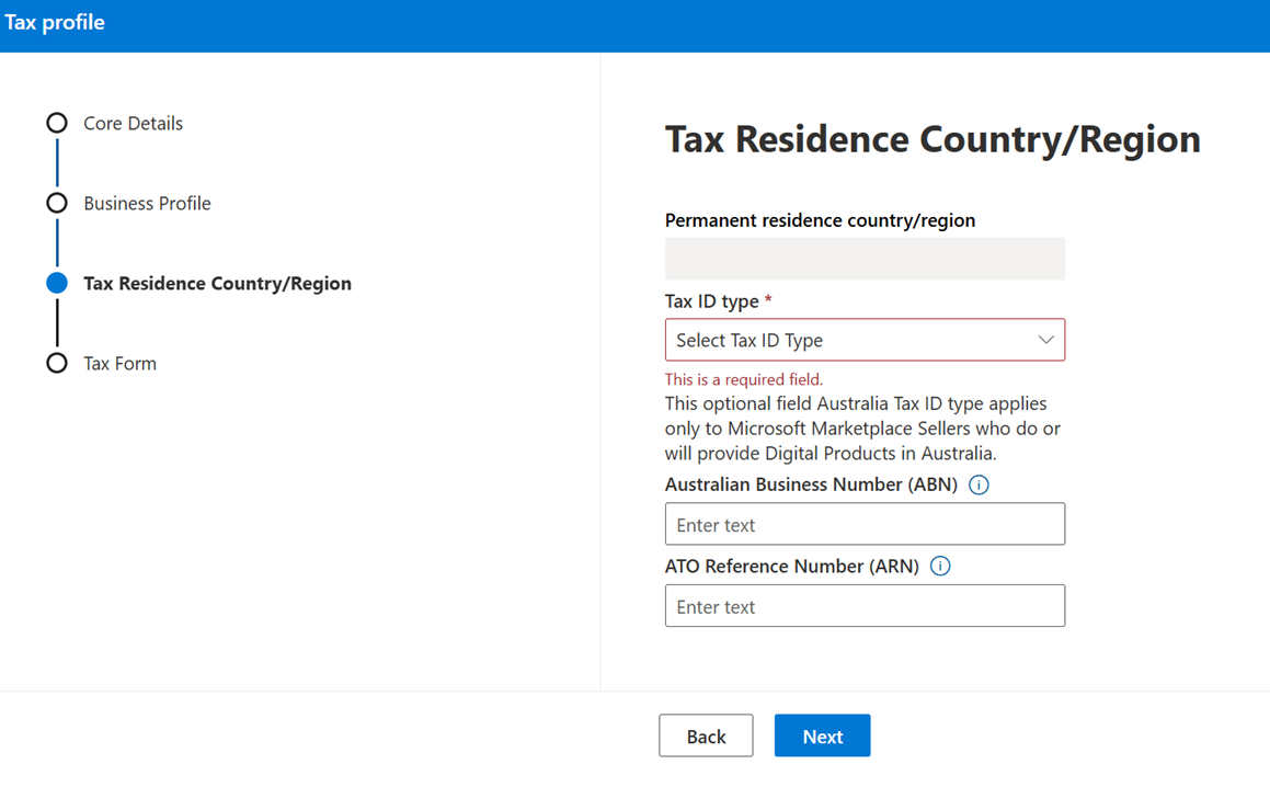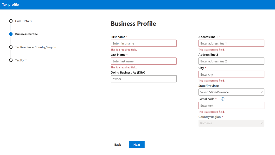 Depending on your selections in step 6, you're prompted to provide the tax information required for your country/region. After completing the business profile details and selecting next, you must launch the tax form option in the tax form section.